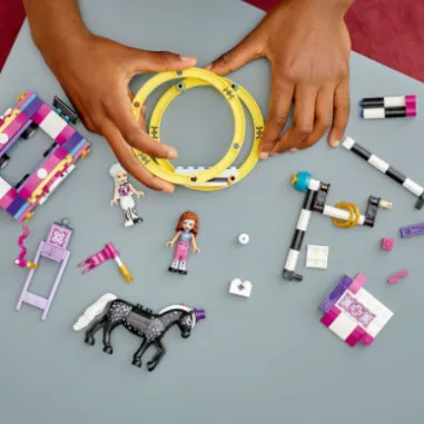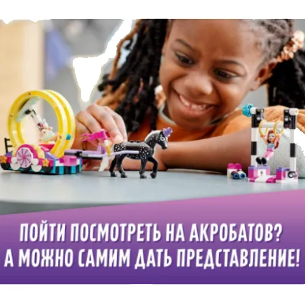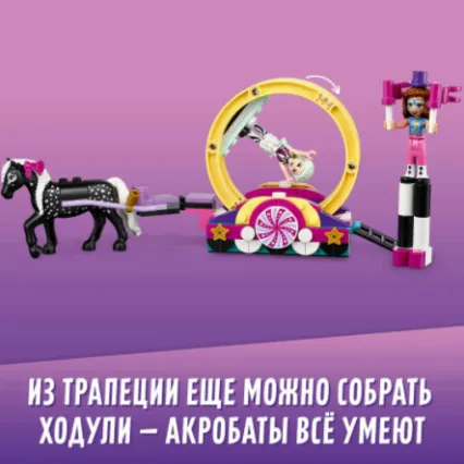 Поучаствуйте в настоящем акробатическом выступлении вместе с конструктором LEGO Friends 41686 «Волшебная акробатика». Посмотрите: Стелла и Оливия уже приступили к репетиции. Обе девушки участвуют в параде, и им очень хочется быть на высоте. Задача Стеллы – прикрепиться к крутящемуся колесу. Помогите девушке вывести под уздцы коня Чекерса: он тянет платформу, на которой и будет вертеться Стелла. Если хотите увидеть номер Стеллы, поднимите девушку на перекладину и наслаждайтесь ее кружением. Оливия – мастер балансировки на ходулях. Подайте новой подружке флаги и посмотрите, как гармонично она будет смотреться на параде. Сборный конструктор – отличный подарок ребенку младшего школьного возраста (от 6 лет и старше) – на день рождения, 1 Июня, Новый год, 23 Февраля, 8 Марта или любой другой праздник.