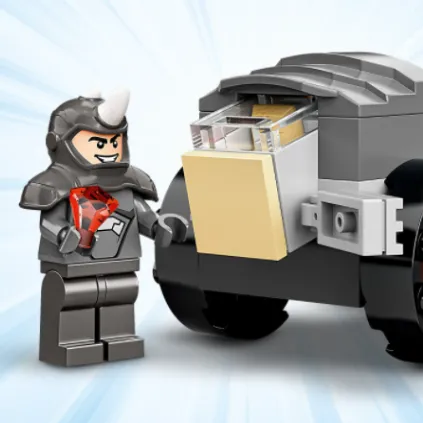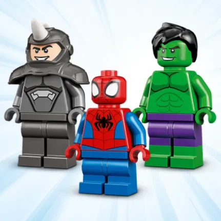 - Множество функций — у сборной игрушки Халка есть две сменные головы с разными выражениями, реактивный ранец Человека-паука стреляет ракетами, а в хранилище есть съемный сейф, который помещается в багажник грузовика Носорога.