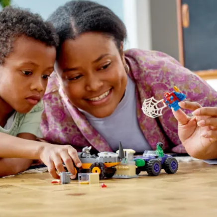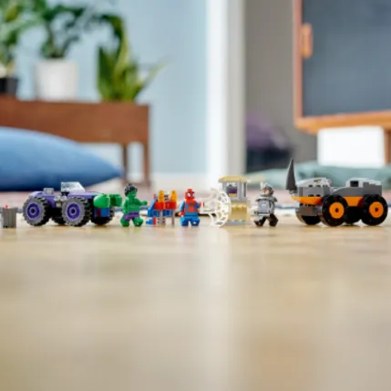 - Подарок для детей, которые любят технику — в наборе «Схватка Халка и Носорога на грузовиках» LEGO Marvel Spidey And His Amazing Friends (10782) есть две машины LEGO, три минифигурки, реактивный ранец Человека-паука и банковское хранилище.