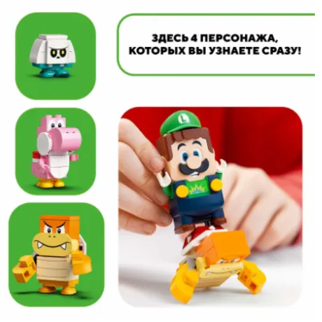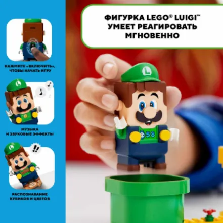 Настройтесь на захватывающие приключения вместе с конструктором LEGO Super Mario 71387 Стартовый набор «Приключения вместе с Луиджи». Стартовый набор познакомит ребят со Вселенной Super Mario или дополнит любой другой конструктор с любимым героем. Наблюдайте, как Луиджи реагирует на Гумбу-Скелета, Бум-Бума и Розового Йоши – персонажей, собранных на других уровнях. Летайте, качайтесь, крутите и получайте больше золотых монет. Найдите блок со знаком вопроса и получите суперсилу звездочки. Приглашайте в гости друзей и расширяйте возможности игрового набора. Придумывайте больше интересных сюжетов или повторяйте уже полюбившиеся сценарии для веселой игры. Интересный набор – лучший подарок ребенку от 6 лет и старше на Новый год, день рождения, 8 Марта, 23 Февраля, 1 Июня или на любой другой праздник. Для творческих игр с Луиджи понадобятся 2 батарейки ААА (не входят в комплект и приобретаются дополнительно).