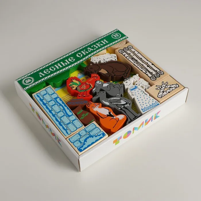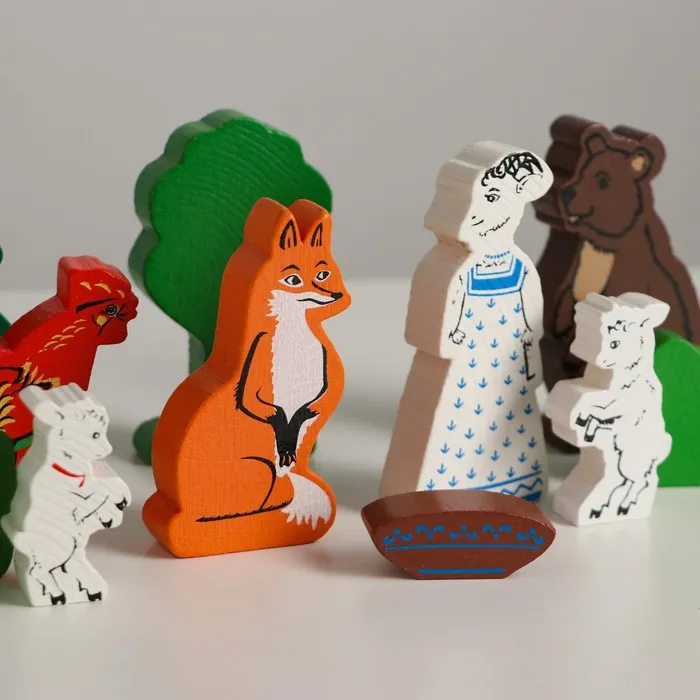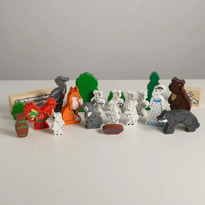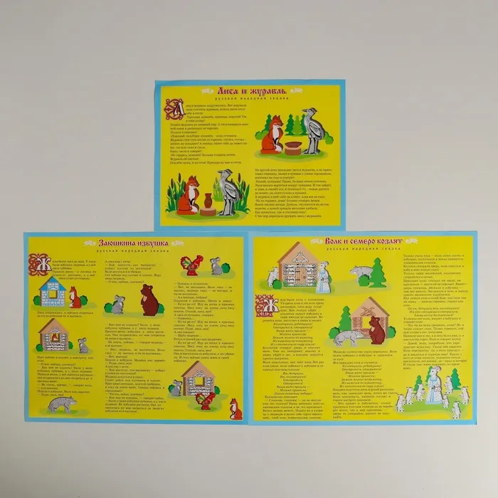 • В наборе 3 сказки: «Лиса и журавль», «Заюшкина избушка» и «Волк и семеро козлят».