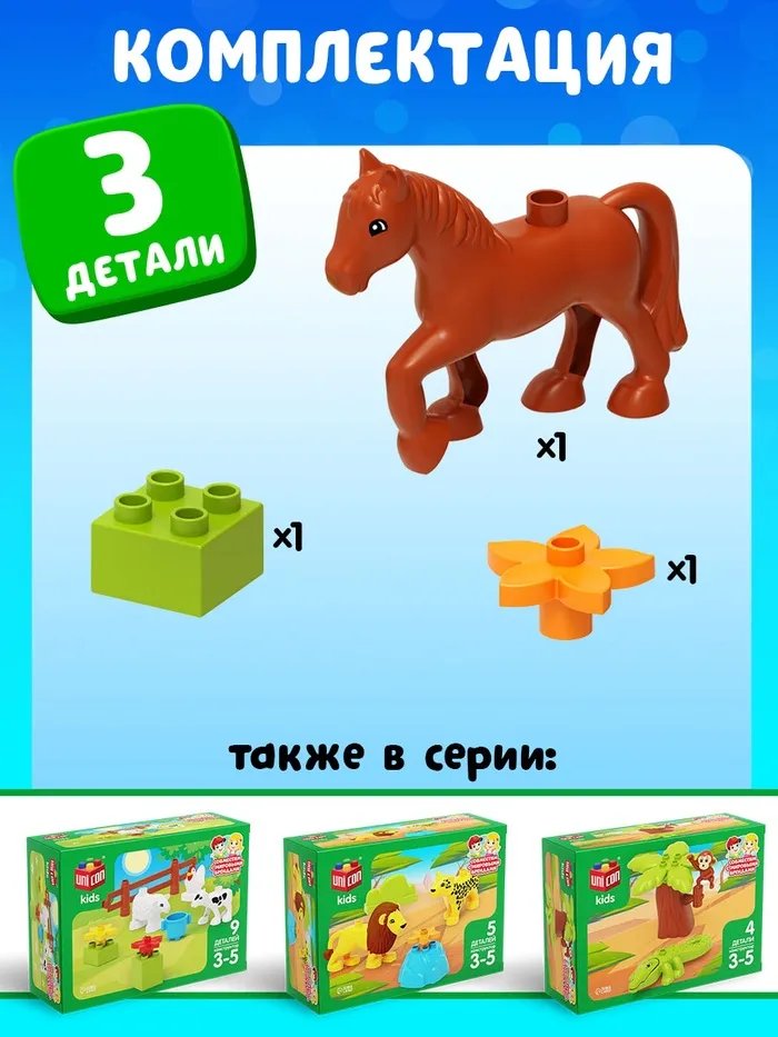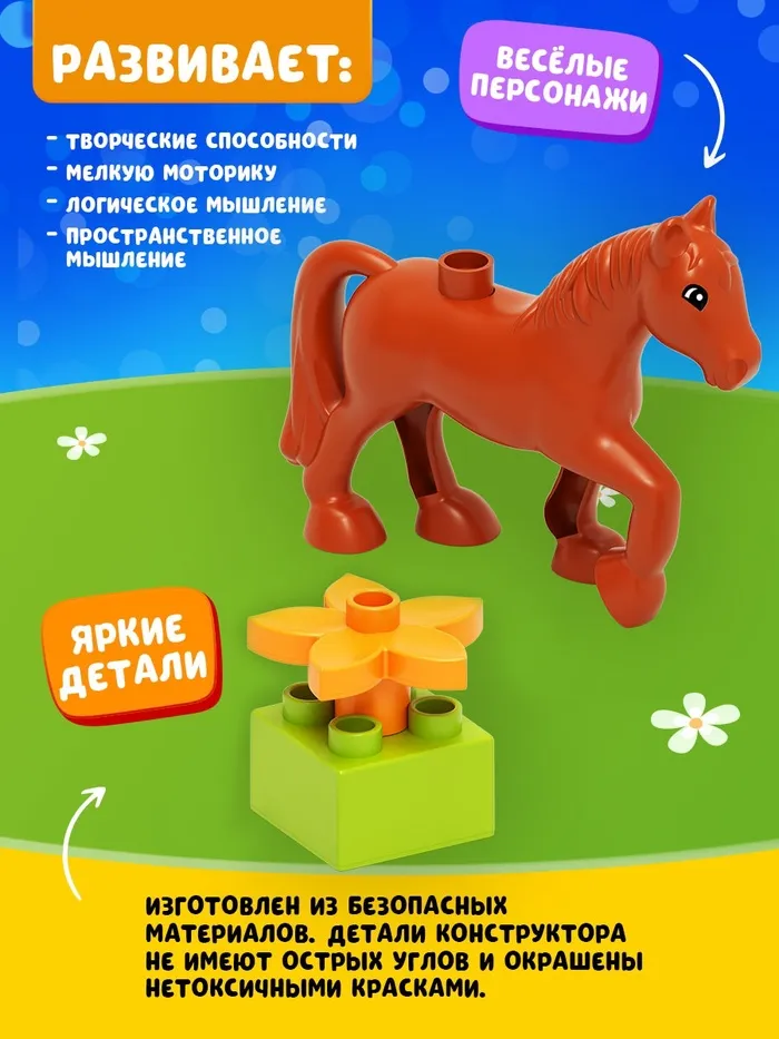 Детский блочный конструктор — это волшебный мир строительства и возможность для развития малыша! Этот набор из крупных пластиковых деталей поможет потренировать мелкую моторику, воображение и логическое мышление ребёнка. Конструктор «Лошадка» поможет малышу больше узнать о жизни домашних животных и об уходе за ними.