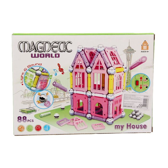 Из элементов этого магнитного конструктора ребёнок возведёт двухэтажный дом. Шарики, имеющие большую силу сцепки, надёжно притягивают детали друг к другу. Сначала начинающему инженеру предстоит собрать каркас будущего коттеджа, а затем вставить в образовавшиеся пазы окна и двери.
