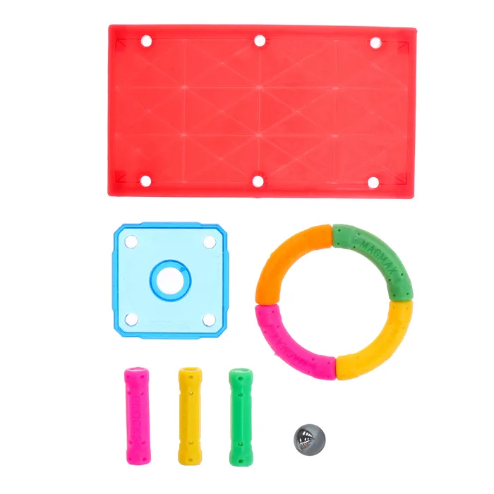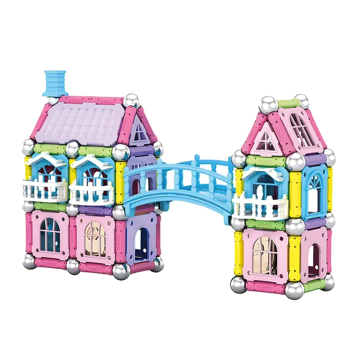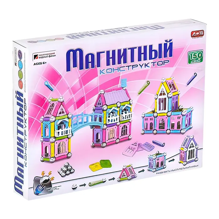 Из разнообразных элементов магнитного конструктора ребёнок с лёгкостью возведёт замок, состоящий из 2 башен. Постройки юный инженер соединит между собой мостиком. Каркас собирается из металлических шариков и пластиковых палочек, которые надёжно сцепляются между собой, а затем в образовавшиеся пазы вставляются окна и двери будущего дома.