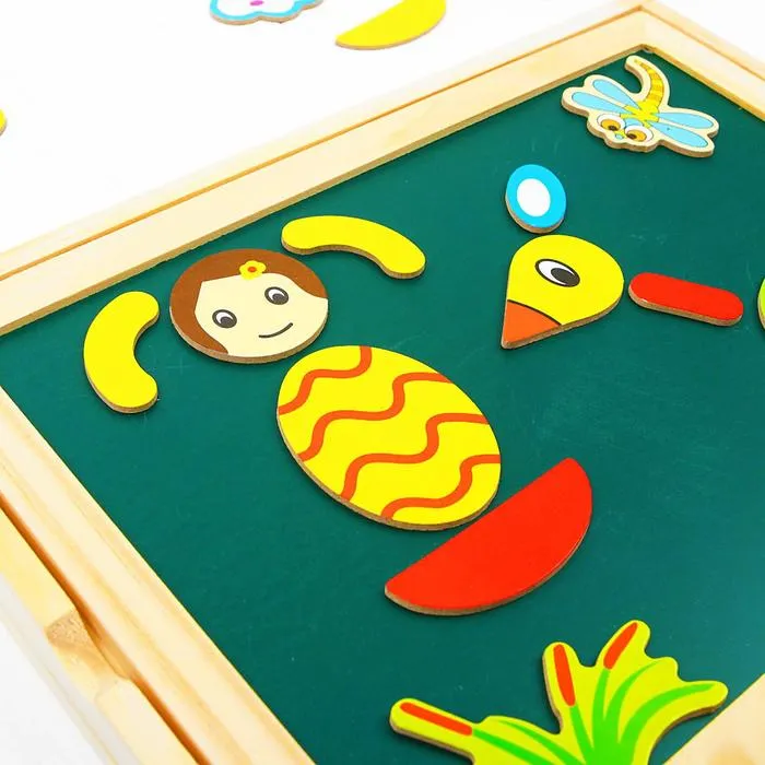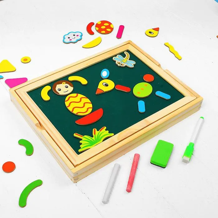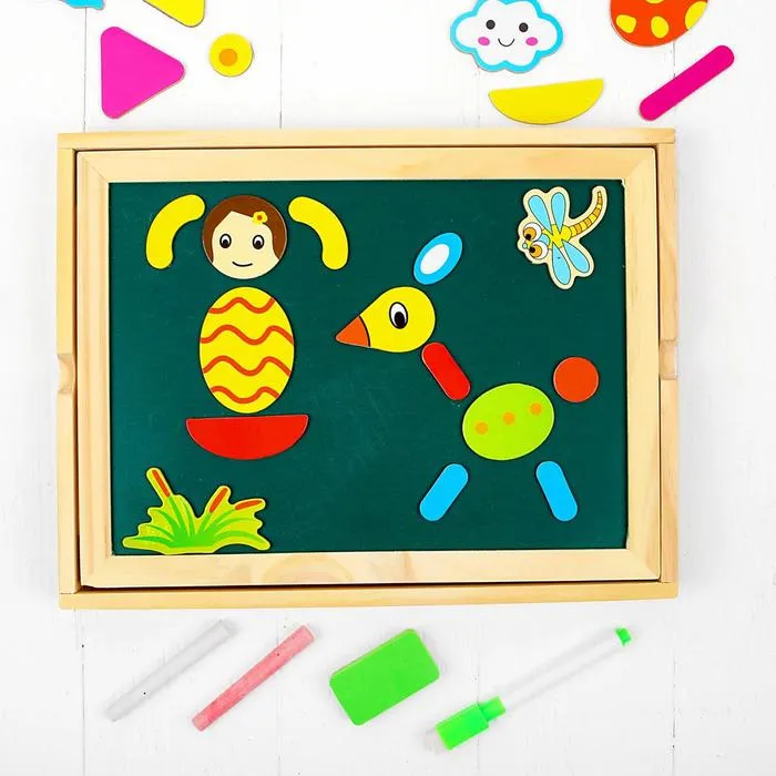 Конструктор магнитный «Весёлые человечки» — это увлекательная детская игра, состоящая из 71 разноцветного элемента, мелков, маркера и вместительной деревянной коробки для удобной транспортировки. Набор можно брать с собой в гости и в дорогу, ведь все детали компактно складываются. Крышка служит в качестве магнитно-меловой доски для игр, рисования водным маркером и мелками.