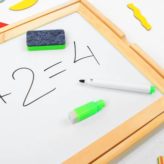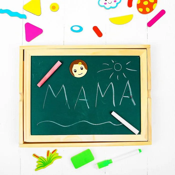 Одна сторона доски магнитная, на ней малыш может играть с картинками. Другая сторона — грифельная, на ней так здорово рисовать цветными мелками.