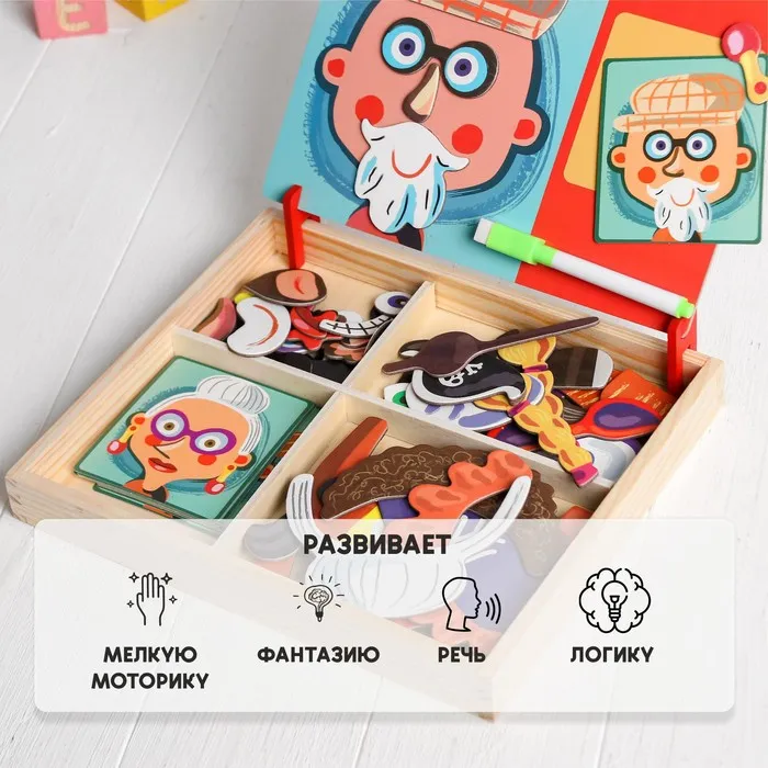 Игра с магнитными элементами помогает ребёнку изучать эмоции, формы и цвета, развивая воображение и когнитивные способности. Процесс сборки лиц из деталей стимулирует мелкую моторику, а обсуждение готовых «рожиц» способствует развитию речи и социальных навыков. Набор станет отличным подарком для малышей, которые любят творить и учиться через игру.