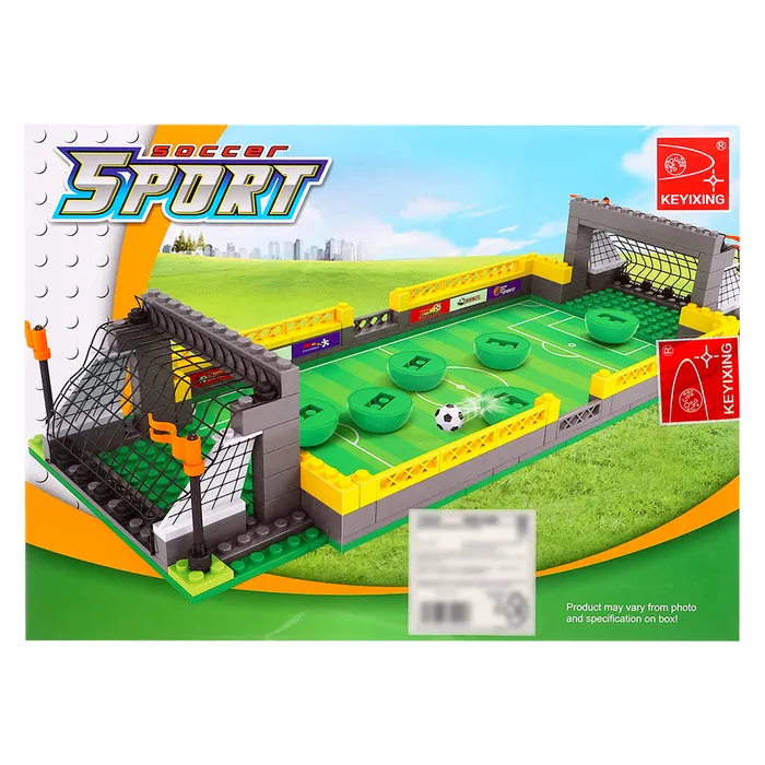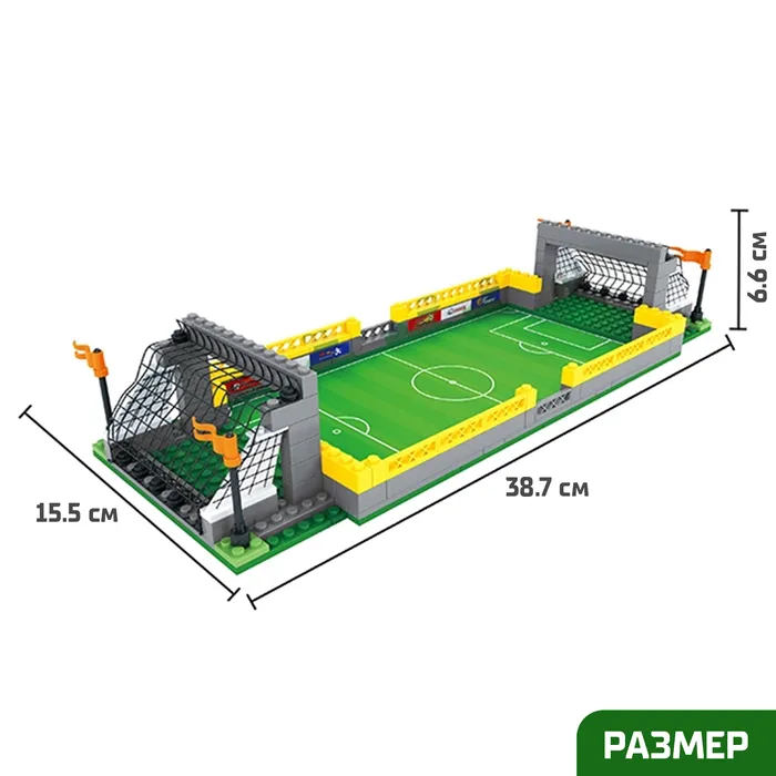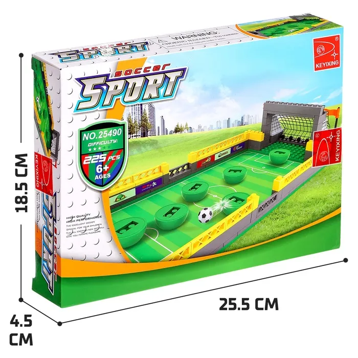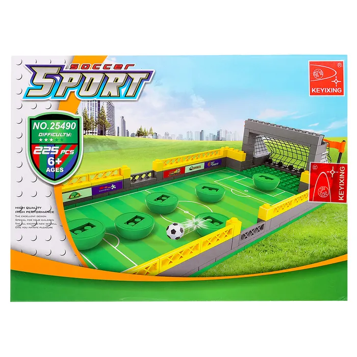 Набор содержит 225 деталей и позволяет сконструировать игровую площадку с воротами и защитными ограждениями. Ребёнок соберёт модуль, установит на подставки фигурки игроков и, перемещая их по полю, будет стремиться забить мяч в ворота соперника.