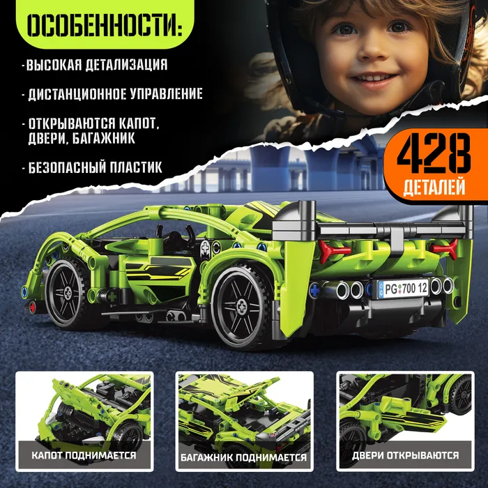 Конструктор Mechanics «Гоночная», радиоуправляемый, 1:16, открываются двери, капот, багажник, работает от аккумулятора, 428 деталей, цвет зелёный — Характеристики
