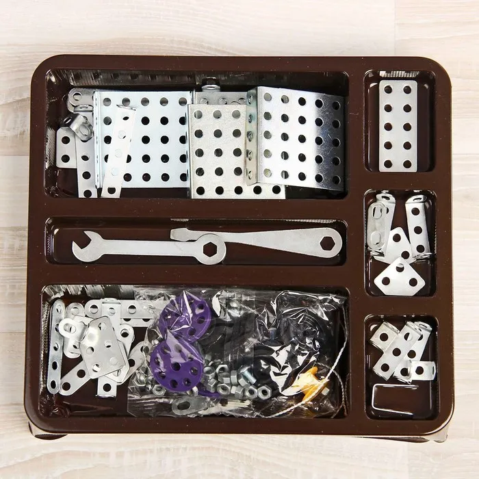 - 146 металлических деталей: В комплект входят пластины, уголки, крепежные элементы и подвижные соединения. Сборка помогает изучить принципы конструирования и развивает пространственное мышление.