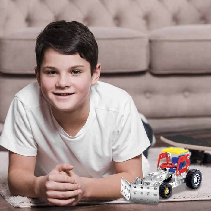Используя отвёртку и гаечный ключ, малыш построит зерноуборочный комбайн, трактор, грузовик или грейдер. Сначала юному инженеру необходимо соединить металлические пластины, как показано в инструкции, а затем закрепить детали через отверстия болтами и гайками.