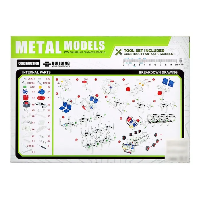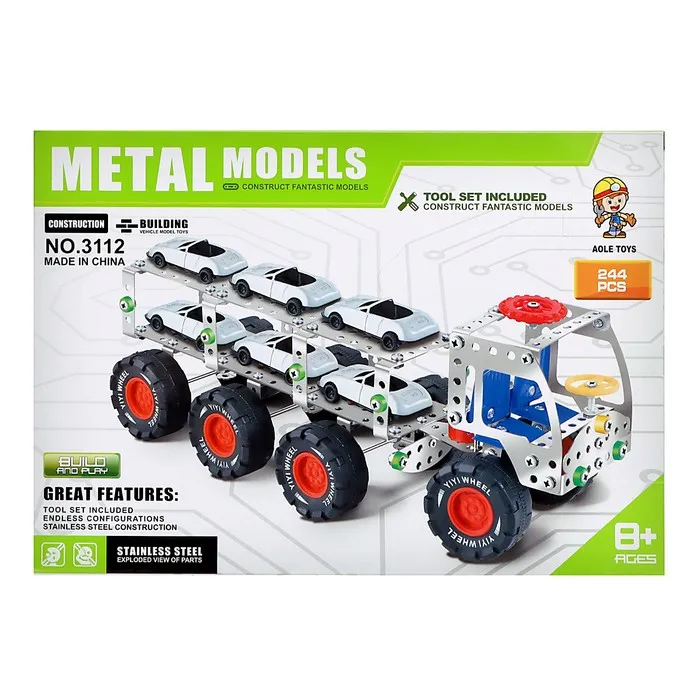 - В комплекте 244 металлические детали для сборки автовоза и 6 машинок.