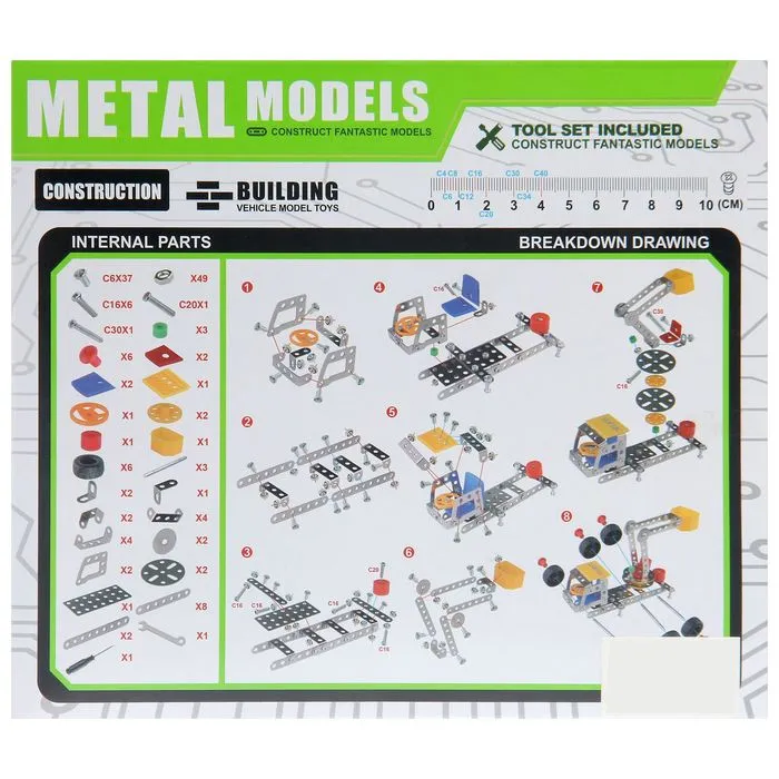 С металлическим конструктором мальчишка начнёт освоение строительной техники, а также спроектирует собственные инновационные модели. По подробной инструкции ребёнок соберёт автокран. Для этого необходимо лишь наложить детали друг на друга и скрепить их через отверстия в пластинах винтом и гайкой.