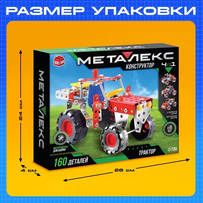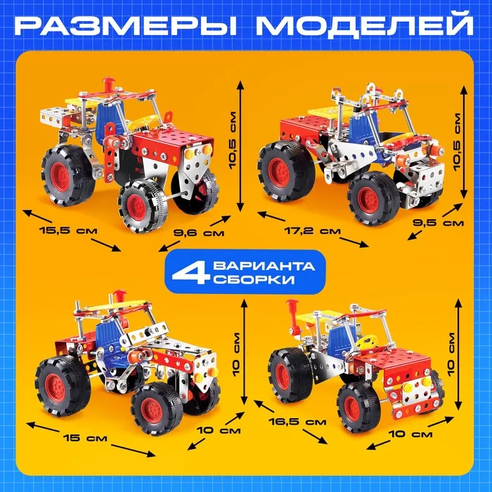 Конструктор металлический «Трактор», 4 варианта сборки, 160 деталей — Характеристики