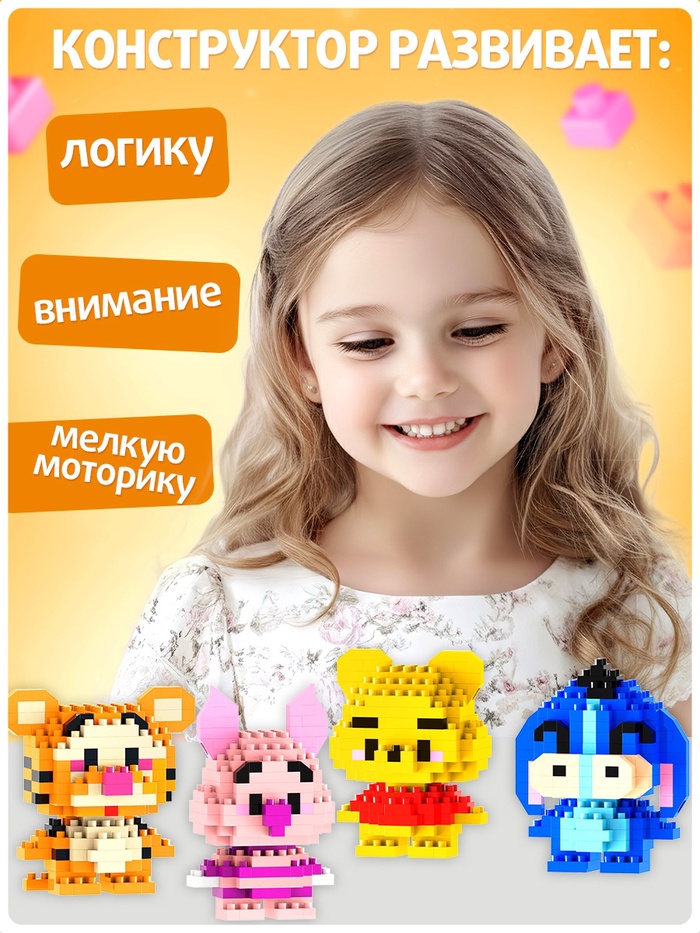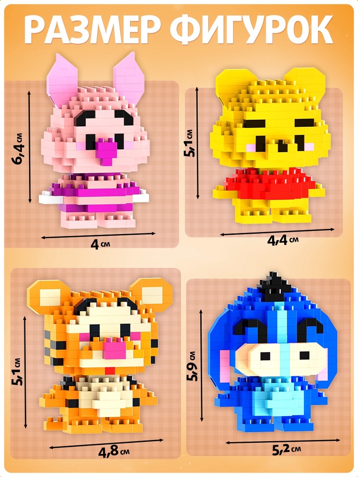 - Четыре классических персонажа: из деталей собираются Винни-Пух, Пятачок, Иа-Иа и Тигра. У каждого героя сохраняются узнаваемые черты и цветовая гамма.