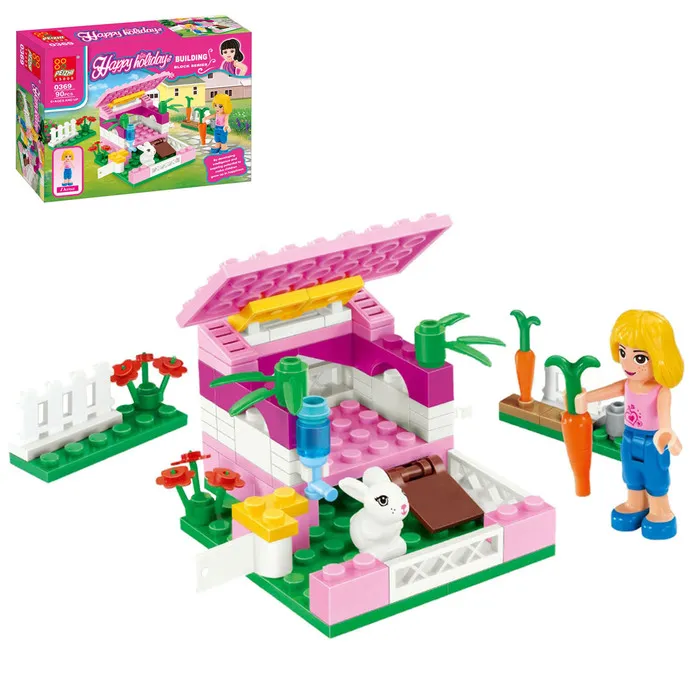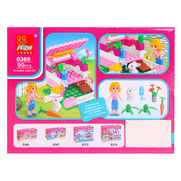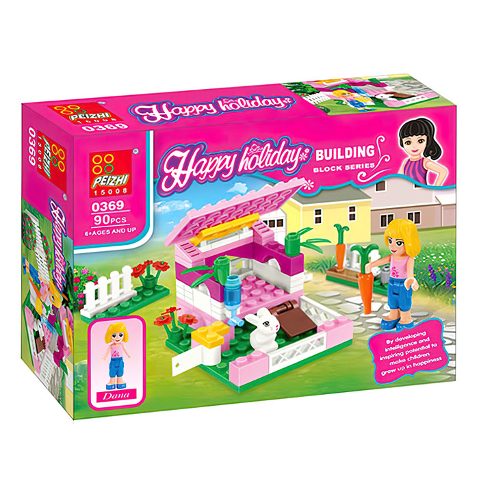 Красочные детали набора пробудят воображение ребёнка и подарят множество идей для игровых сюжетов. Из 90 элементов малышка соберёт садовый участок, где станет выращивать цветы и овощи и заботиться о кролике. Для пушистого любимца юная хозяюшка построит вольер с кормушкой и поильником.