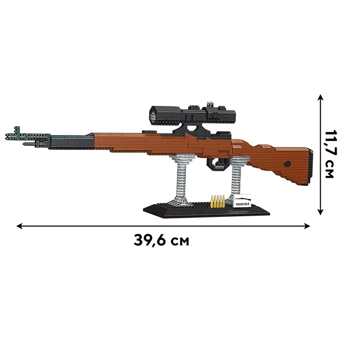 - Точная детализация – 1130 элементов: Модель включает проработанные механизмы, создавая реалистичный облик исторической винтовки. Процесс сборки помогает лучше понять её устройство.