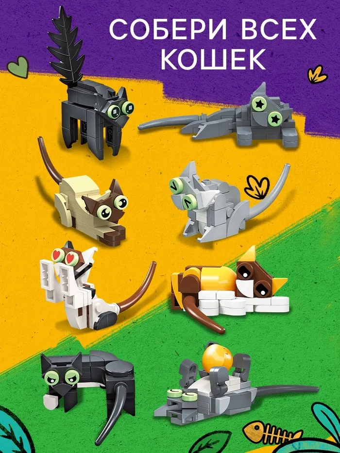 Построй уютный уголок для забавных котят! Конструктор «Кошачий мир» позволяет собрать 9 разных моделей. Дети смогут придумывать свои сценарии игры, объединять элементы и экспериментировать с дизайном.