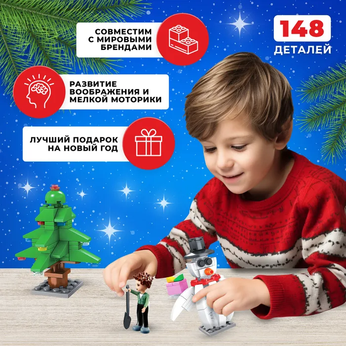 - Игровой набор содержит 148 деталей. Из них ребёнок соберёт ёлочку и снеговика.