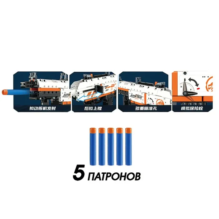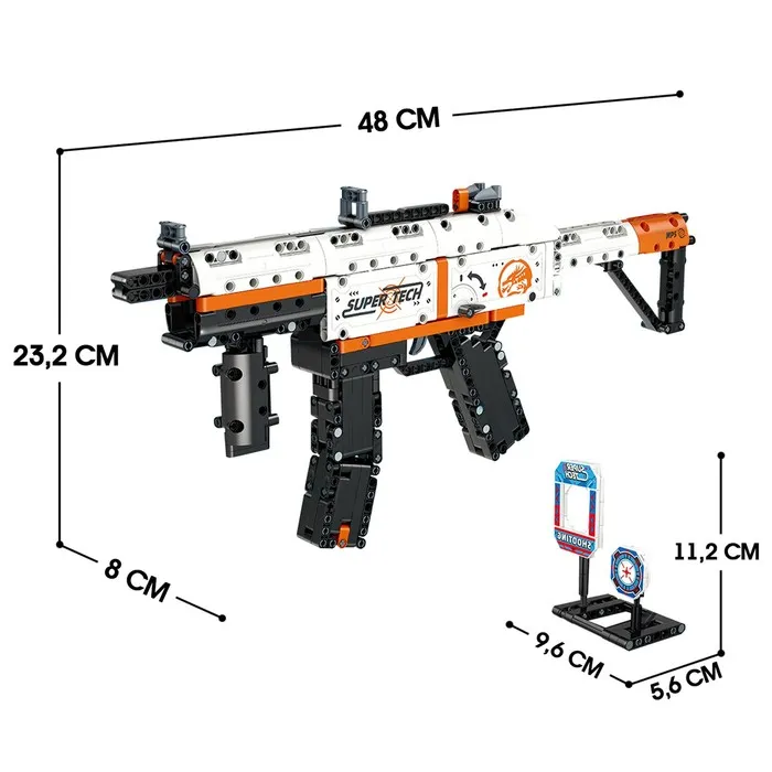 Собери точную копию легендарного оружия! Конструктор Оружие «MP-5 с рукояткой» позволяет воссоздать детализированную модель с подвижными элементами. Готовая сборка стреляет мягкими пулями, что делает игру ещё интереснее.