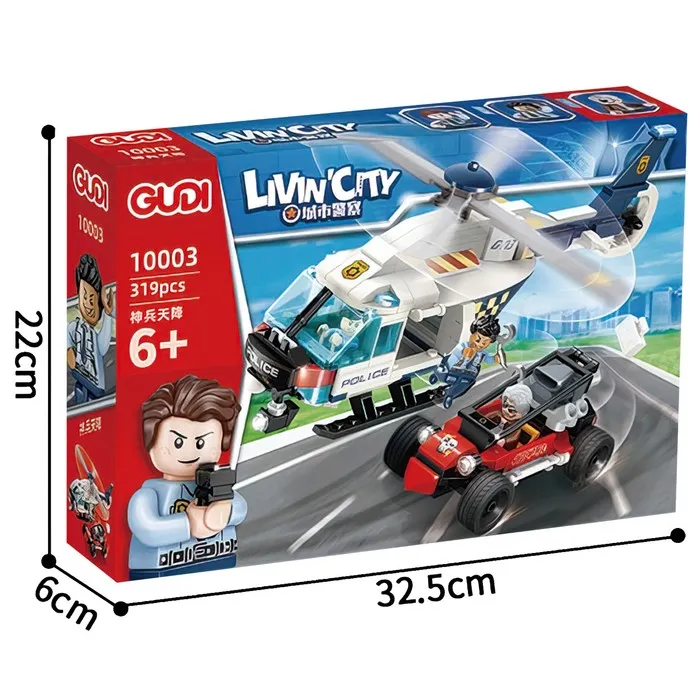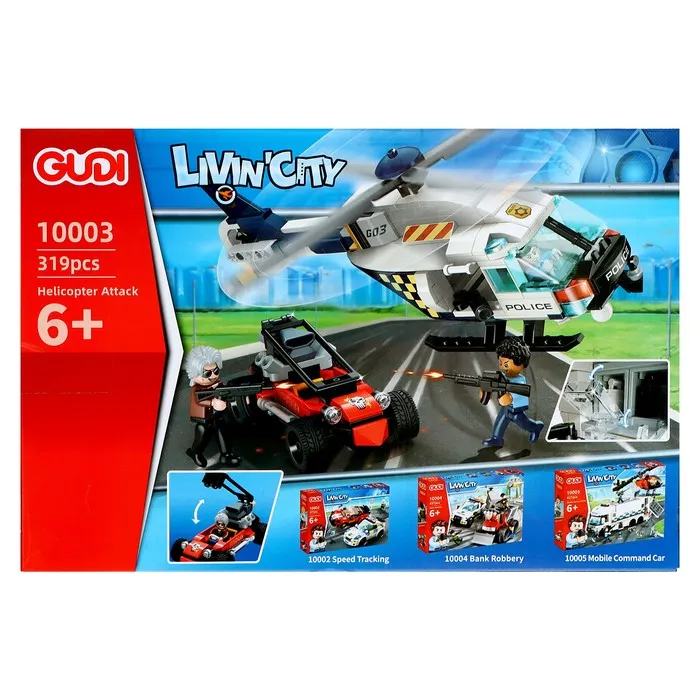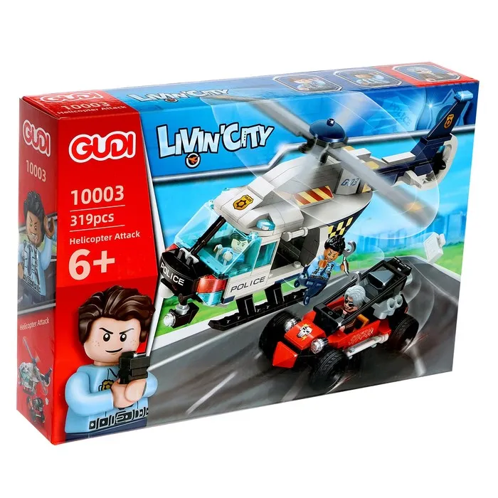 - Реалистичный дизайн: Вертолёт с детализированными винтами, мини-фигурки с аксессуарами и точными элементами техники создают эффект реальной погонки.