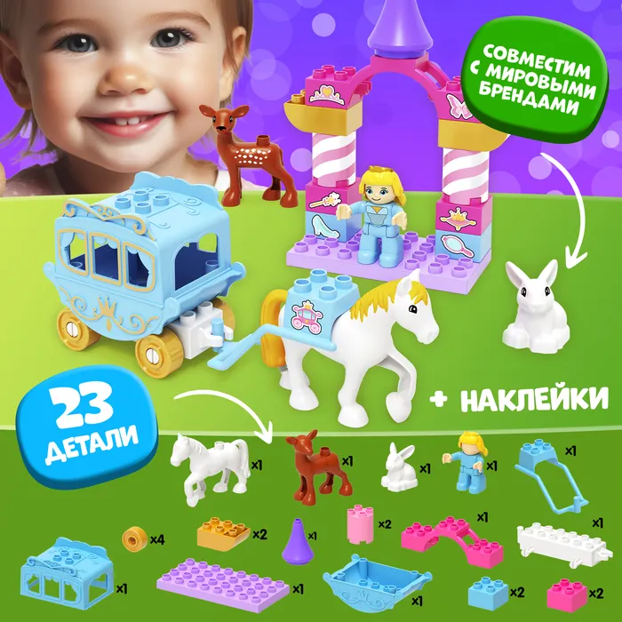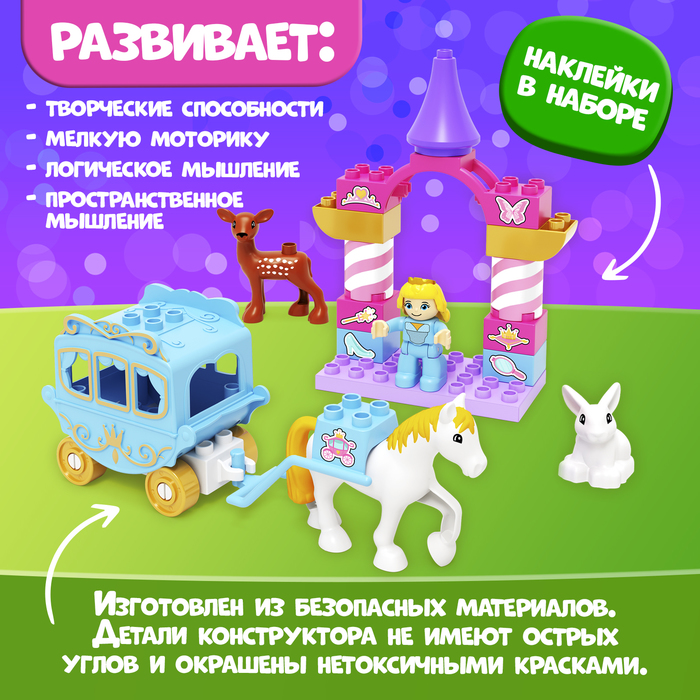 С конструктором «Принцесса» малышка сможет отправиться в невероятное приключение на роскошной карете по сказочному лесу. Её верными спутниками станут волшебные звери: кролик и оленёнок, которые также есть в комплекте.