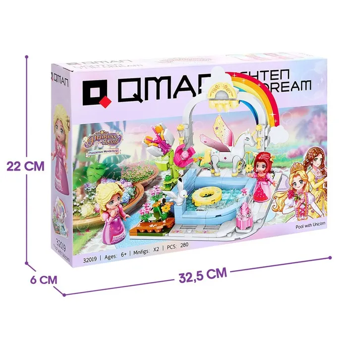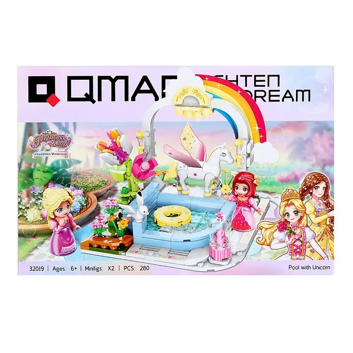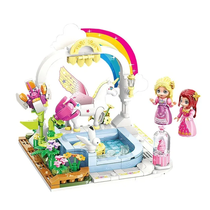 Из конструктора «Бассейн с единорогом» девочка соберёт сказочную локацию с принцессами и волшебной лошадкой. Бассейн украшен большими красивыми цветами, а над единорогом сияет радуга.