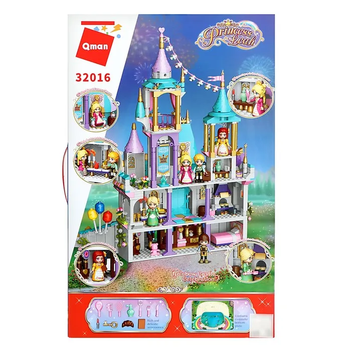 Большой набор конструктора «Радужный замок» приятно удивит девочку, порадует её и надолго займёт увлекательной игрой. У готового замка 2 башенки, радужная лестница, украшенная воздушными шариками, а во дворе стоит фонтан!