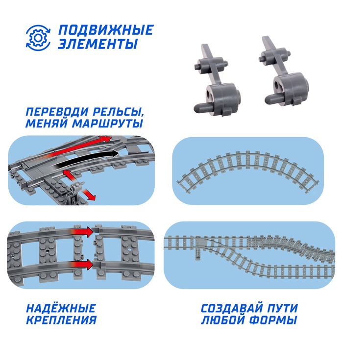 - Подвижные стрелки и поворотные рельсы: в набор входят стрелочные переводы — ребёнок сможет менять направление движения, разветвлять пути и создавать сложные развязки. Детали двигаются плавно, игра становится динамичнее.
