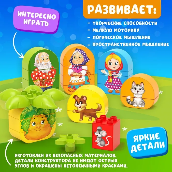 Благодаря конструктору «Репка» малыш сможет познакомиться с любимыми героями русской народной сказки. Этот набор поможет маленькому непоседе детальнее изучить персонажей. Ребёнок сможет придумать свой вариант развития событий и организовать работу всех персонажей истории, а также развить важные навыки.