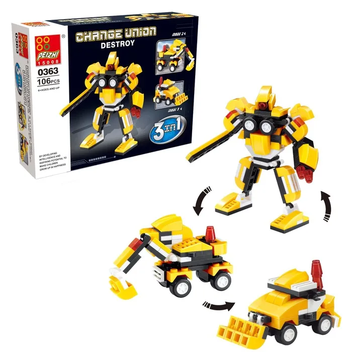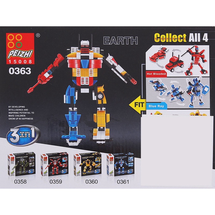 Неуязвимый воин торговой марки Peizhi способен принимать форму строительной техники. Робот меняет модификацию соответственно случаю. В обычный день машина расчищает и утилизирует космический мусор, а во время атаки межгалактических захватчиков за несколько простых движений перевоплощается в непобедимого кибервоина. Мальчишка сам выберет сценарии для игры и соберёт одну из трёх моделей робота.