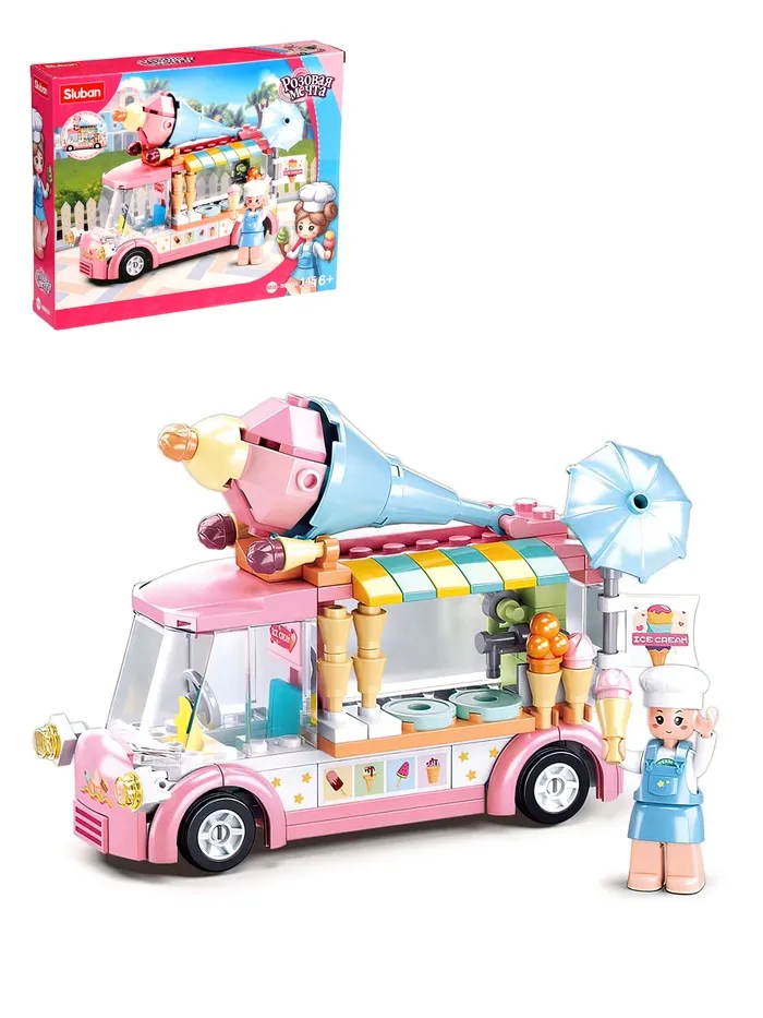 Конструктор развивает мелкую моторику и творческое мышление. Готовый фургон станет героем летних историй — можно играть в продавца мороженого или устраивать пикники для кукол. Отличный подарок для детей, любящих сладкие приключения!