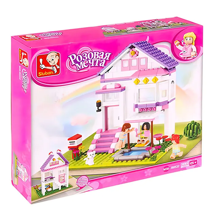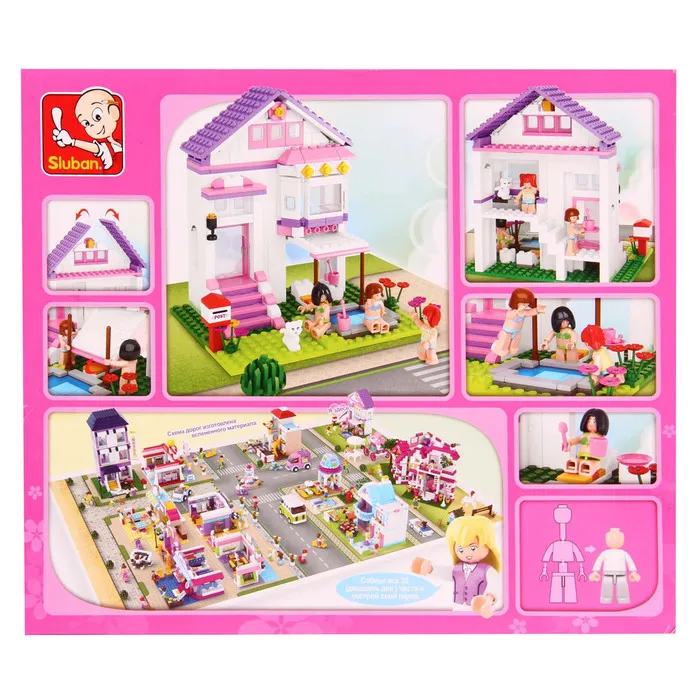 Игровой набор содержит 291 деталь и позволяет сконструировать роскошный двухэтажный коттедж с балкончиком и верандой, бассейн с лужайкой и 2 фигурки девочек-подружек.