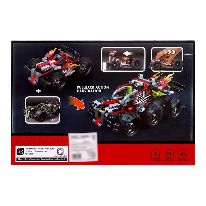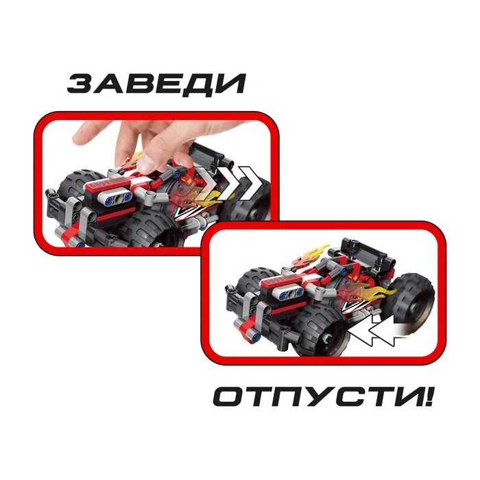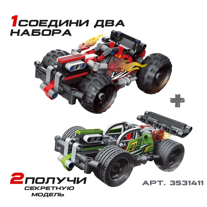 Соберите свою гоночную машинку с инерционным механизмом! Этот конструктор создан для умелых ручек и любознательных умов. Секрет: соедините эту модель с другой и получите эксклюзивную третью версию машинки.