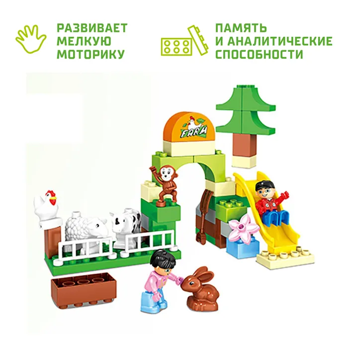 Обитатели этой фермы никому не дадут заскучать. С озорной обезьянкой, петухом, зайцем, коровой и барашком ребёнок придумает множество увлекательных сюжетов. Он с удовольствием будет заботиться о животных, построит для них вольеры, горки и посадит деревья.