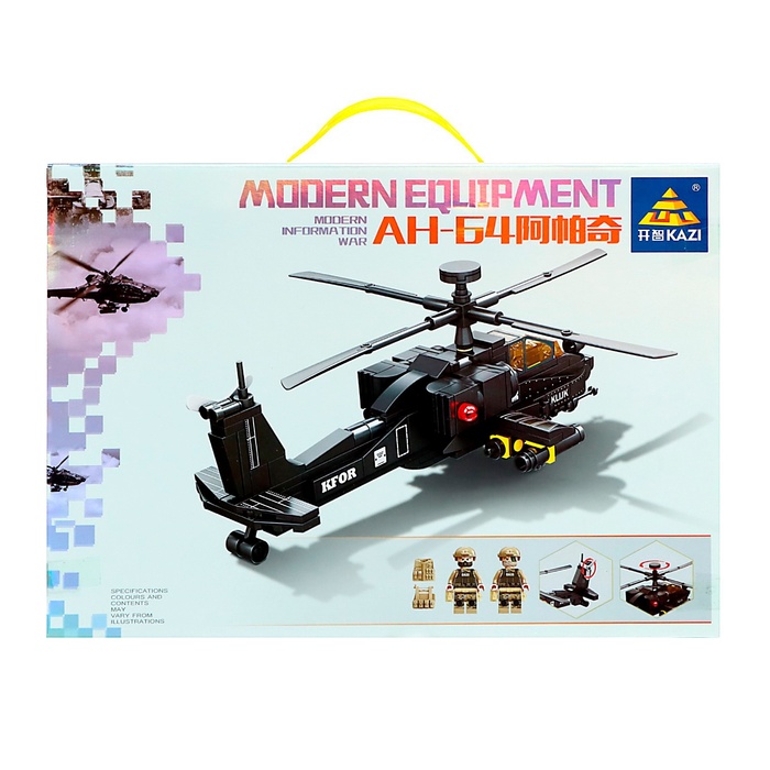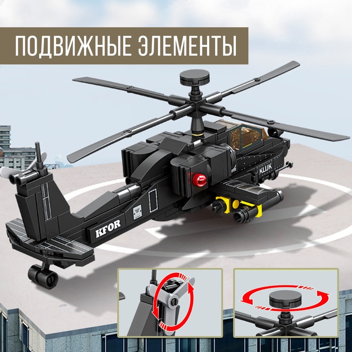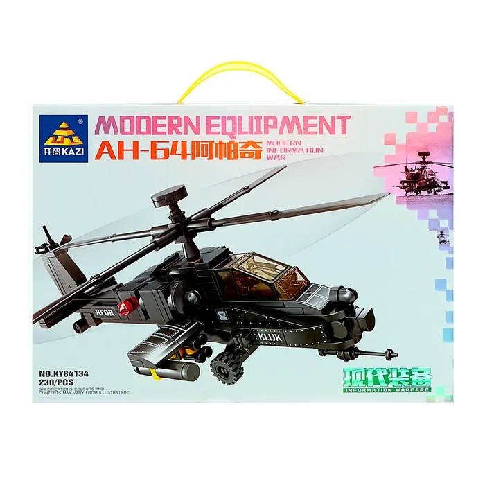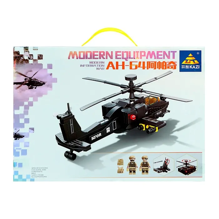 - Реалистичный дизайн: Конструктор точно передаёт формы знаменитого ударного вертолёта Апач — от кабины пилотов до вооружения.