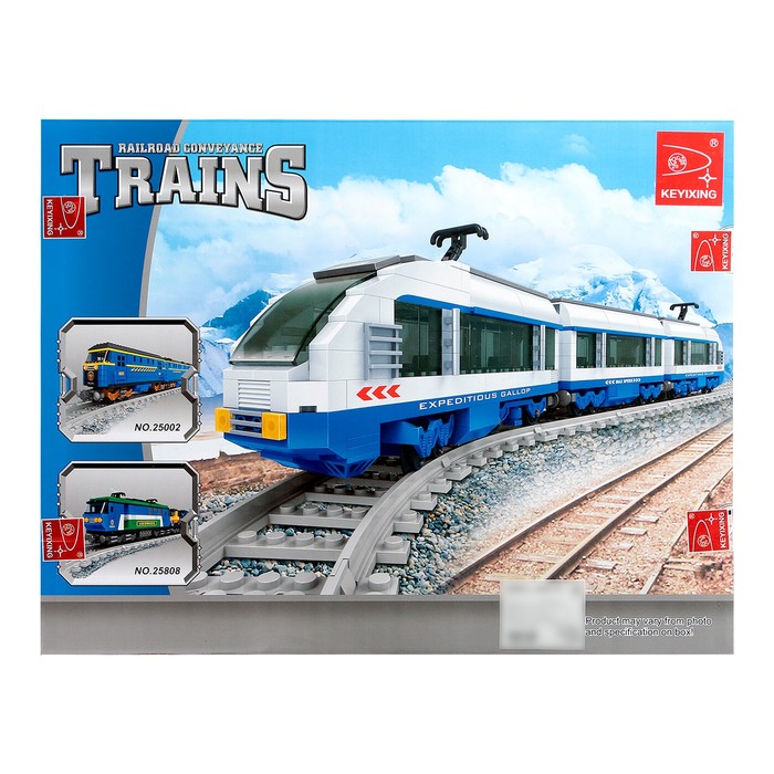 - Полная инфраструктура в одном наборе: в сборку входят два пассажирских вагона, локомотив и рельсовый путь с поворотами. Готовая трасса образует замкнутый маршрут — поезд может ездить по кругу.