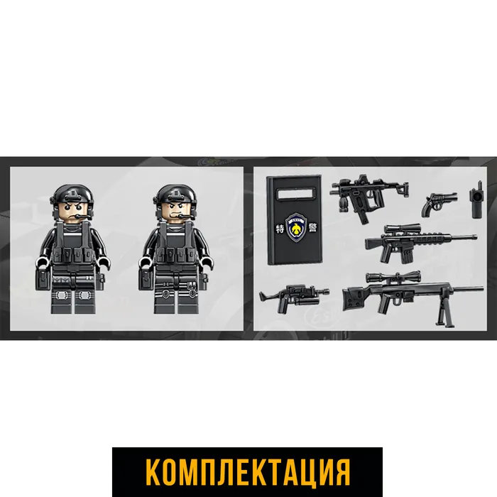 - Фигурки и аксессуары: В комплект входят мини-фигурки бойцов с оружием и щитом, а также другие аксессуары для создания полноценного сценария операции.