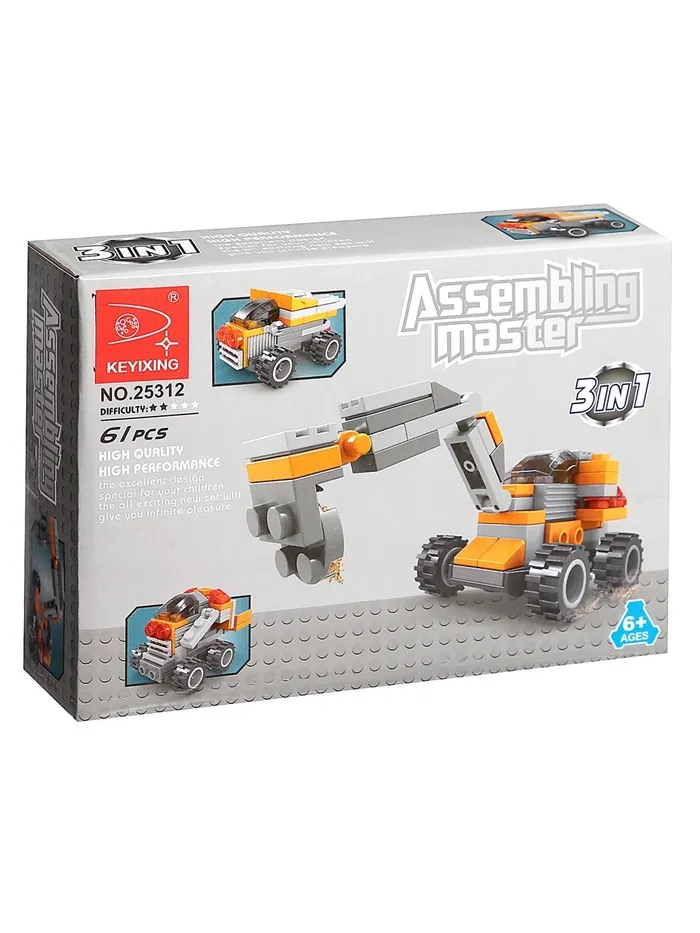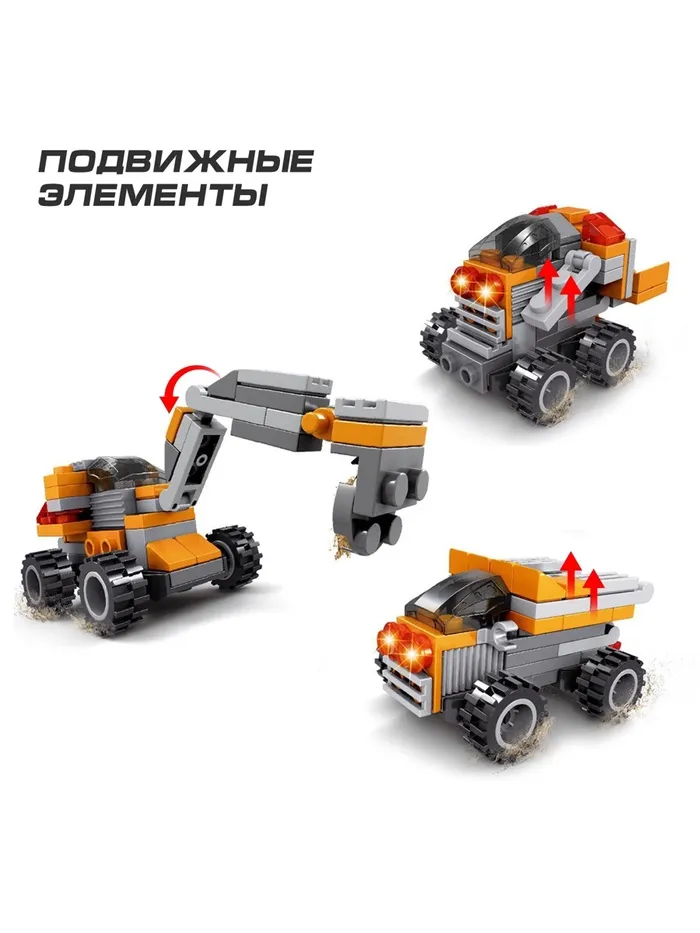 Набор содержит 61 деталь и позволяет сконструировать один из трёх вариантов спецтехники. Подвижные детали, разнообразные элементы пробудят воображение ребёнка, мальчишка придумает множество ярких сюжетов с оригинальными машинами.