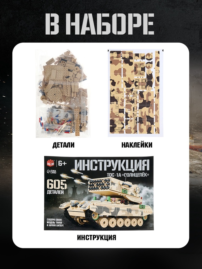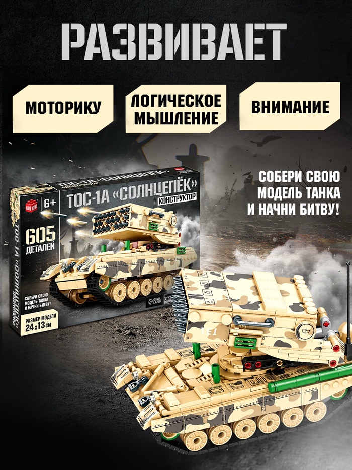 Собери грозную машину огня! Конструктор «ТОС-1А Солнцепёк» — это 605 деталей для создания точной копии уникальной боевой единицы. Сборка модели требует внимания и развивает инженерное мышление.