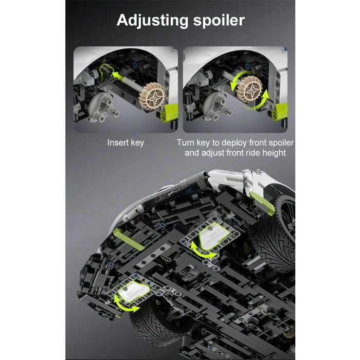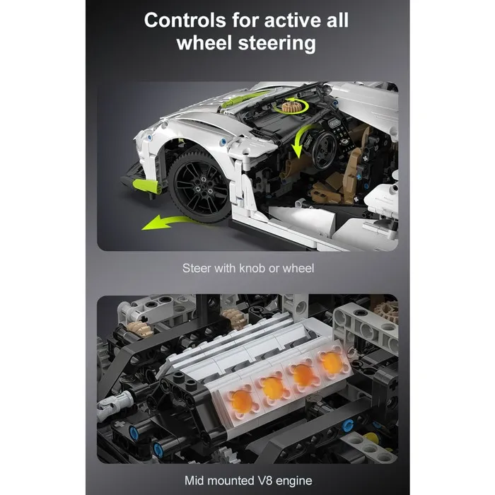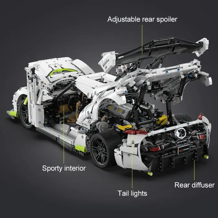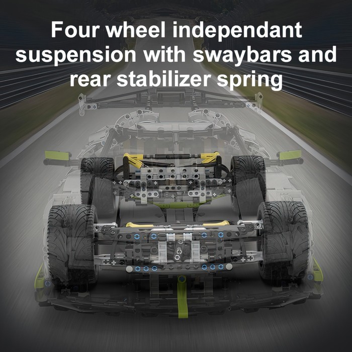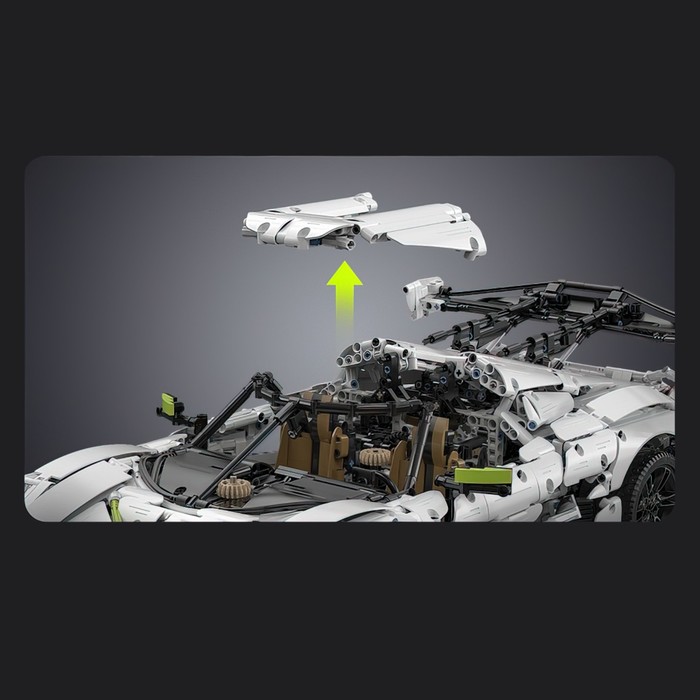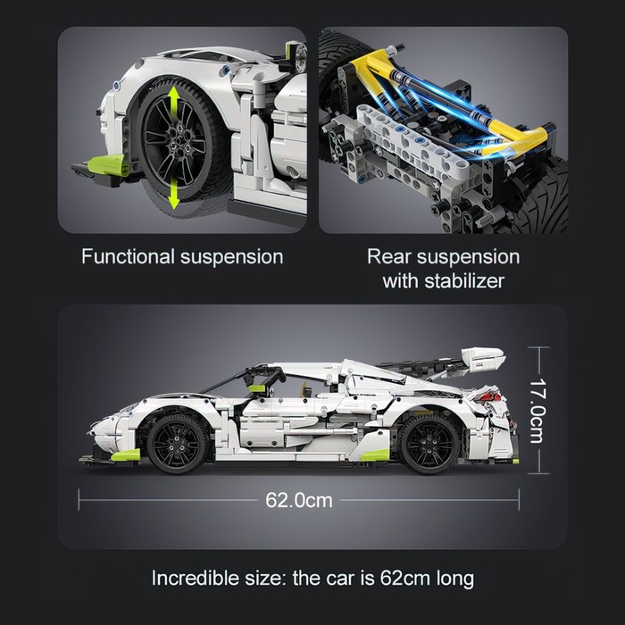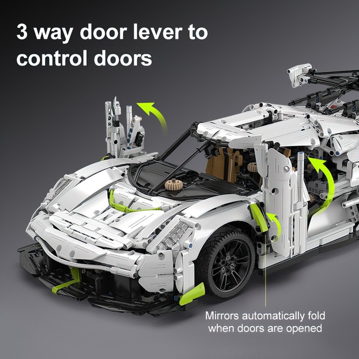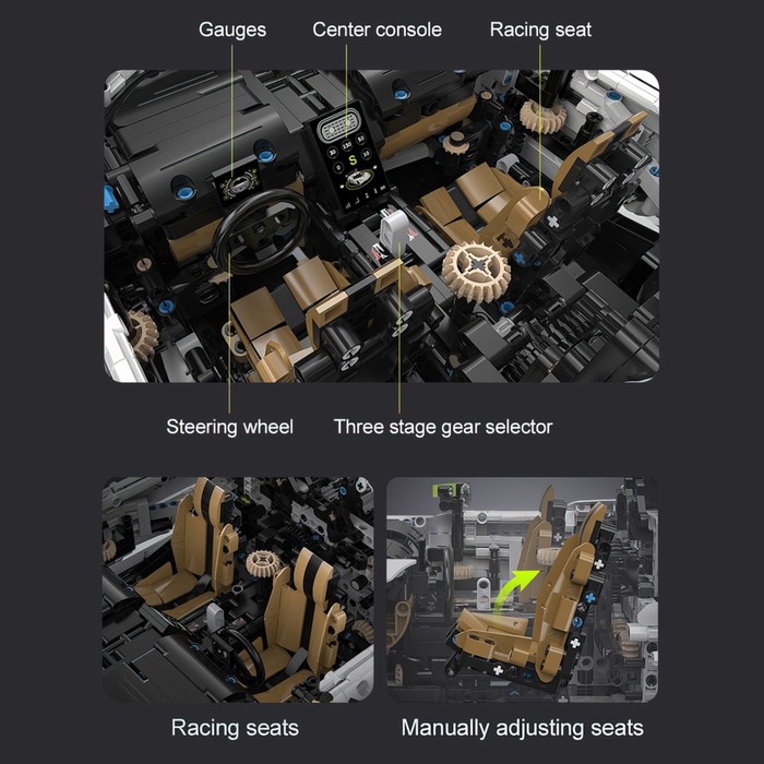 Конструктор оснащен множеством функциональных элементов, которые делают его максимально похожим на настоящую машину. В модель встроена реалистичная подвеска с амортизаторами, открывающиеся двери, капот и багажник, а также функционирующий руль и рычаг переключения передач.