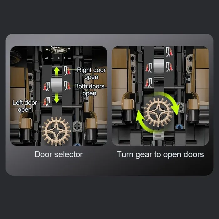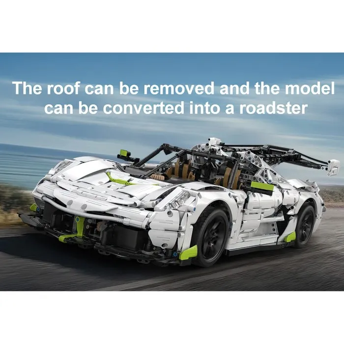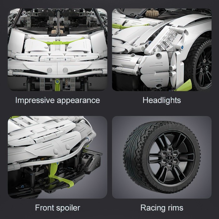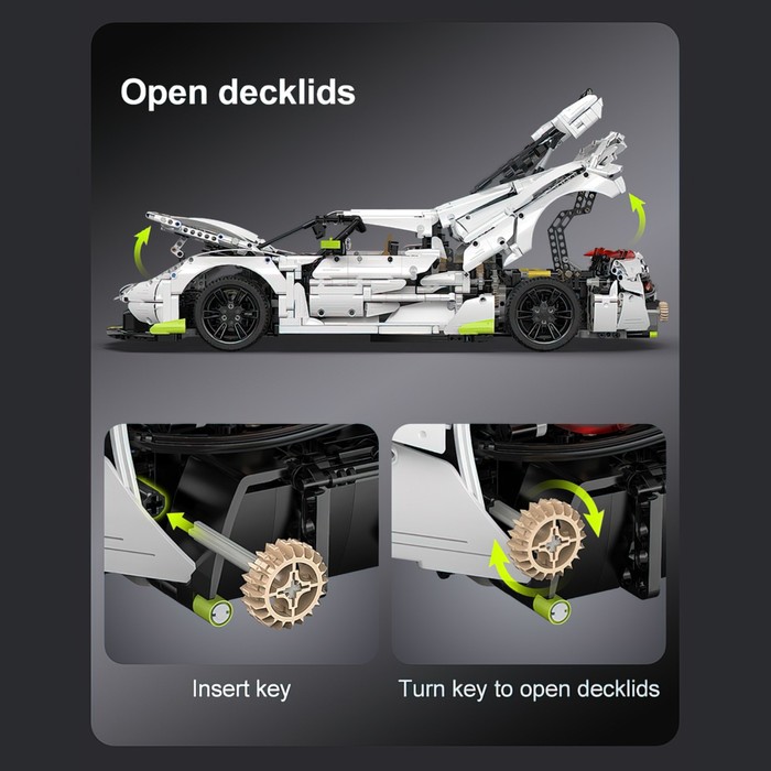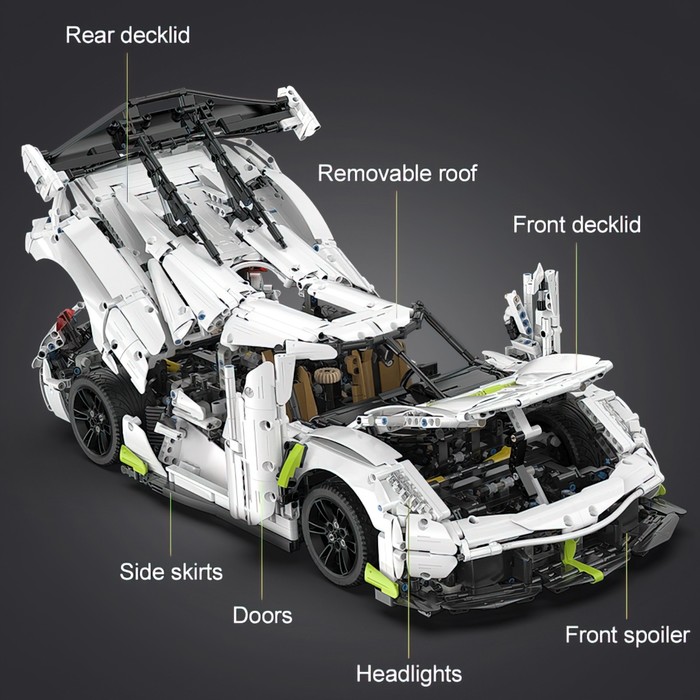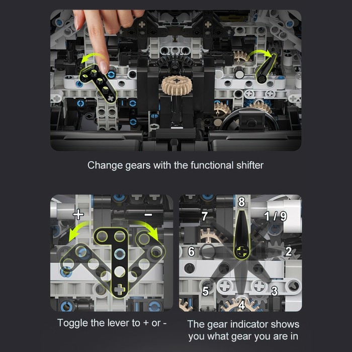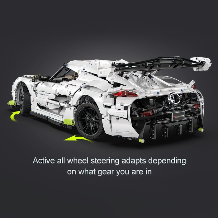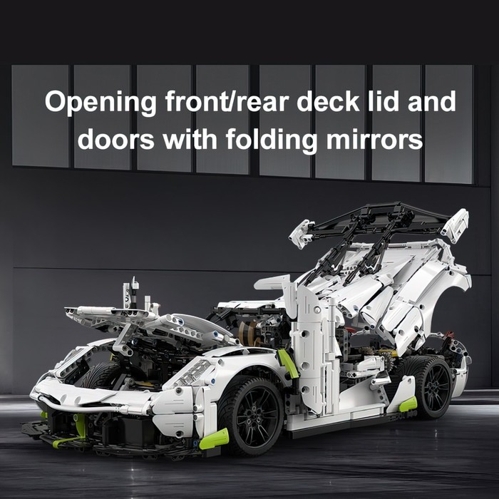 Конструктор оснащен множеством функциональных элементов, которые делают его максимально похожим на настоящую машину. В модель встроена реалистичная подвеска с амортизаторами, открывающиеся двери, капот и багажник, а также функционирующий руль и рычаг переключения передач.