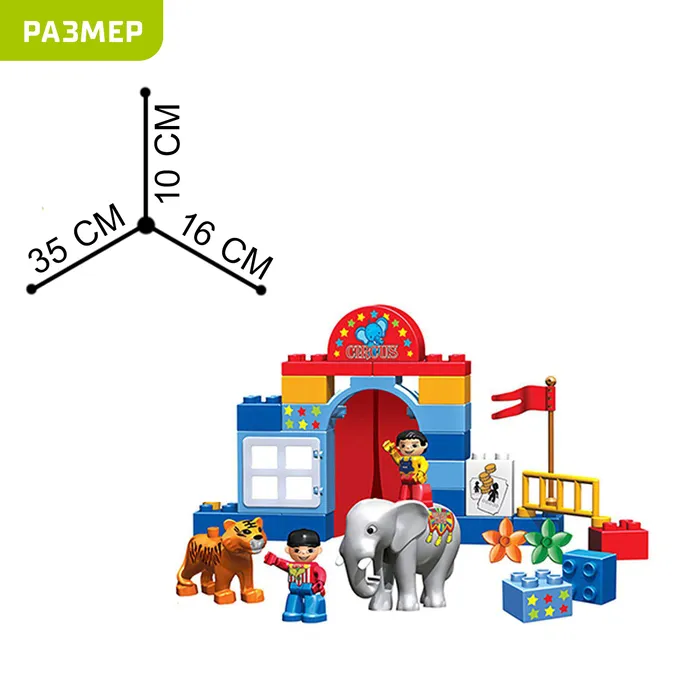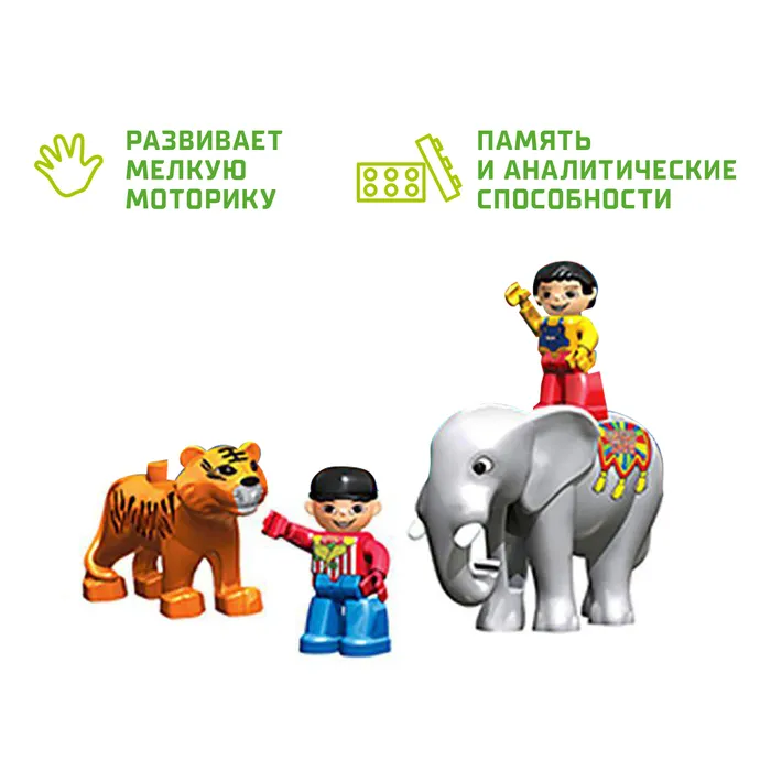 С этим конструктором ребёнок устроит грандиозное представление. Из 39 деталей малыш соберёт цирковую арену с животными и артистами, научит слона, лошадку, тигра и собачку делать невероятные трюки и продемонстрирует незабываемое шоу своим друзьям.