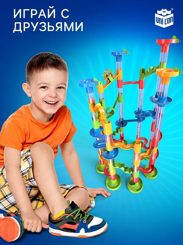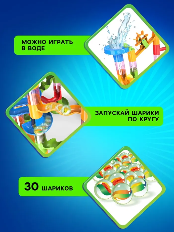 Набор состоит из прозрачных трубочек, разноцветных мостиков, извилистых дорожек и мельниц. Малыш без труда соорудит трассу любой длины и сложности и будет следить за перемещениями шариков.
