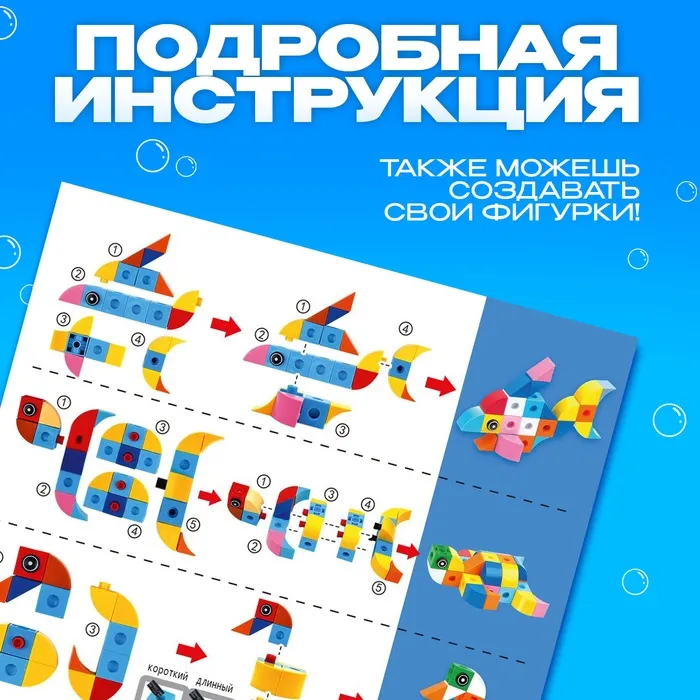 - Элементы легко соединяются друг с другом. Из них можно собрать необычных морских обитателей или любую другую фигурку — фантазируйте и придумывайте свои сюжеты!