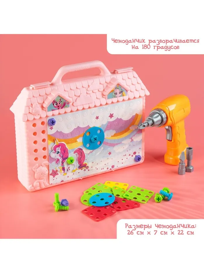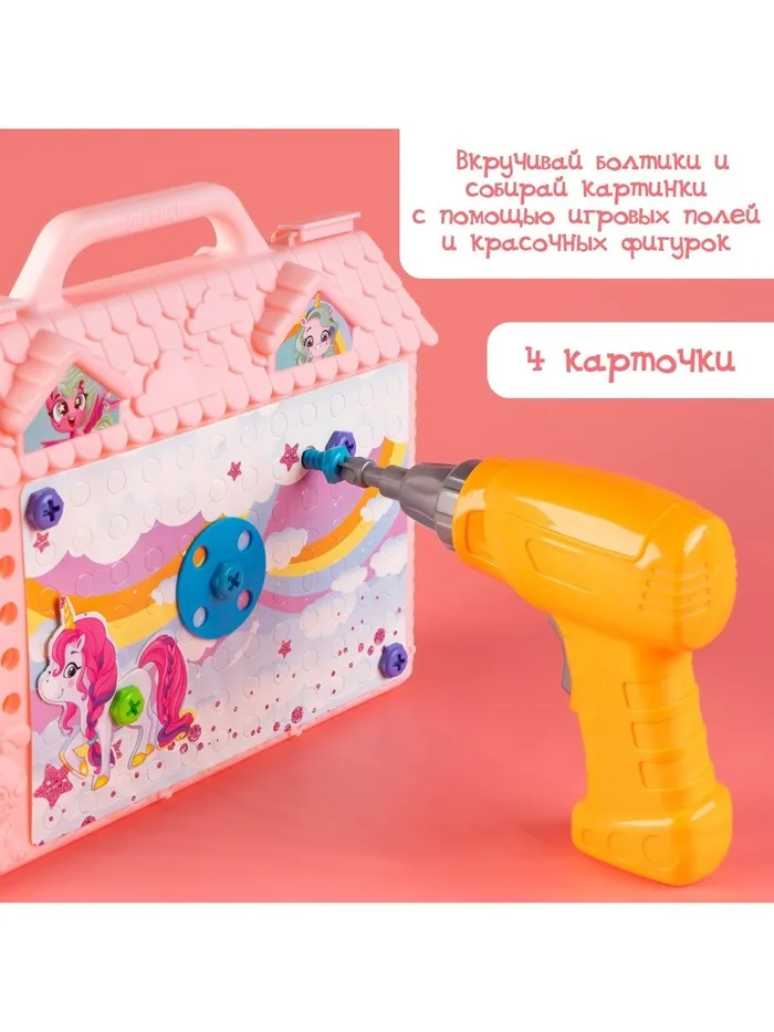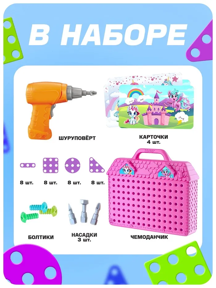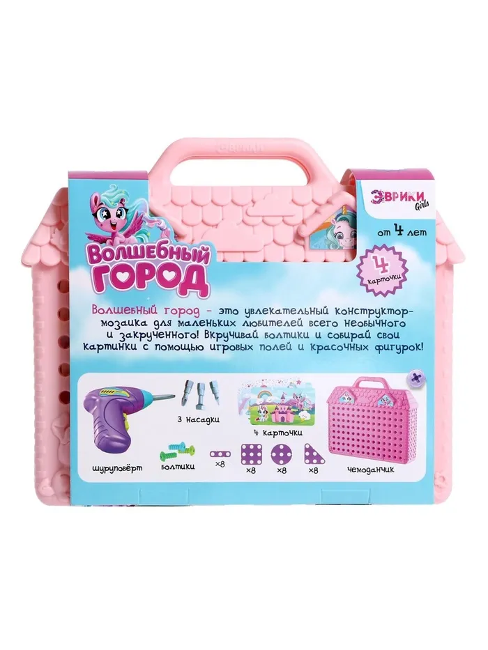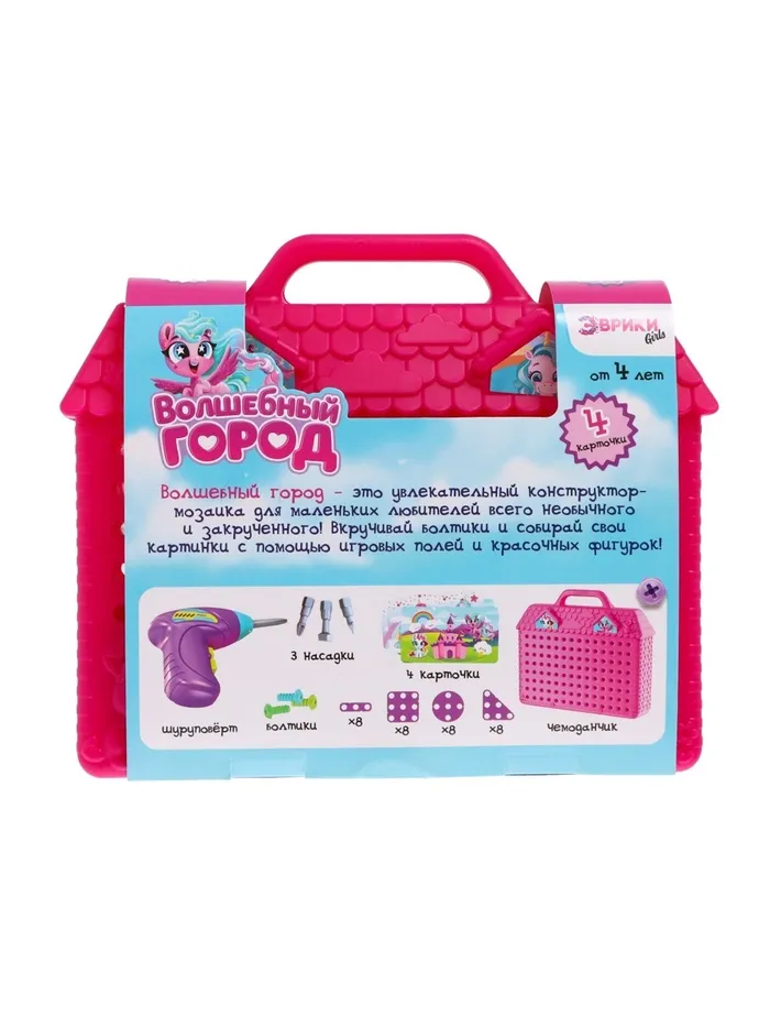 Конструктор в чемоданчике «Волшебный город», с электрическим шуруповёртом, 4 карточки, 57 деталей — Характеристики