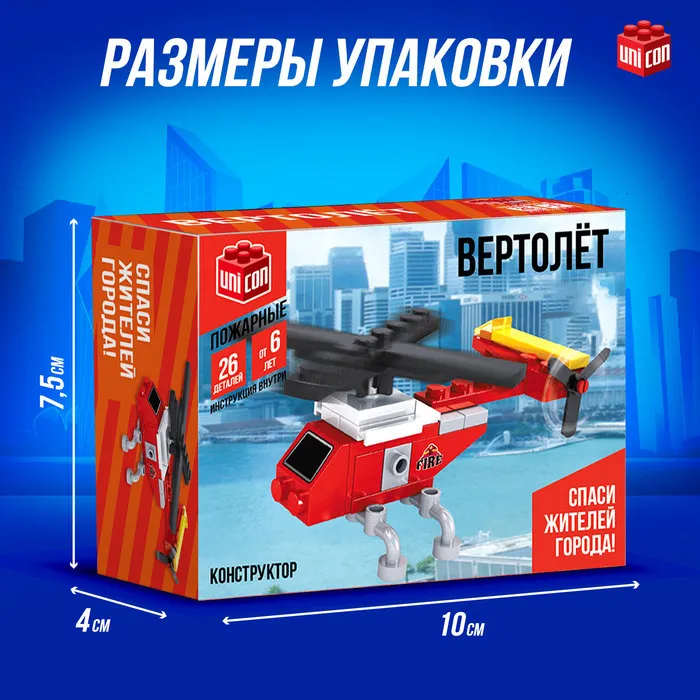 Поднимись в небо на спасательном вертолёте! Конструктор «Пожарный вертолёт» – это 26 деталей для сборки модели воздушного спасателя.
