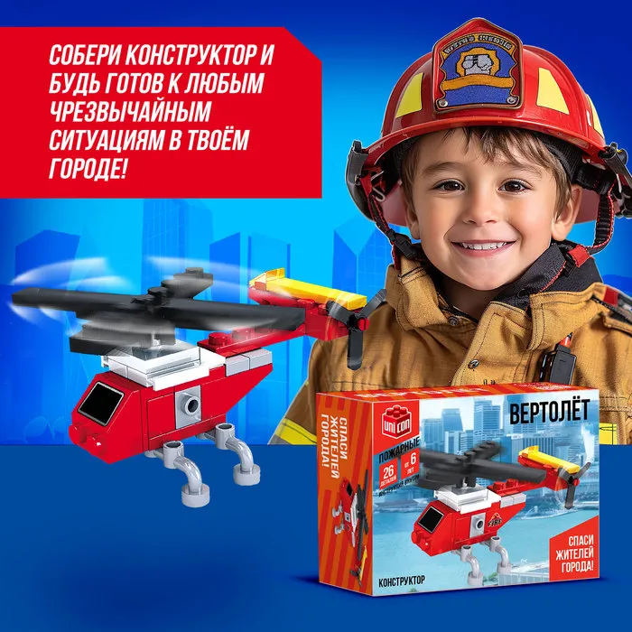 - Лёгкая сборка: классические пластиковые детали соединяются за 15 минут. Ребёнок самостоятельно соберёт вертолёт с узнаваемыми очертаниями пожарной техники.