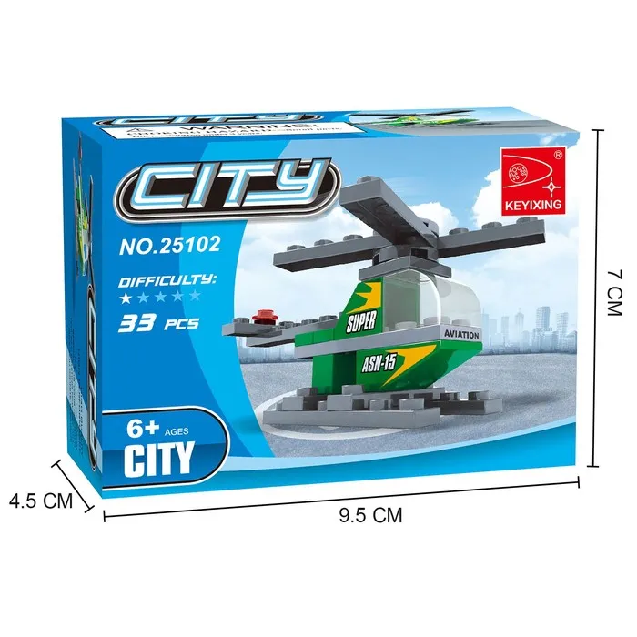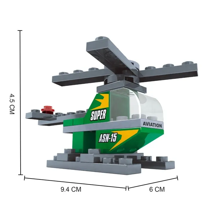 - Набор содержит 33 детали и позволяет сконструировать вертолёт и фигурку пилота.