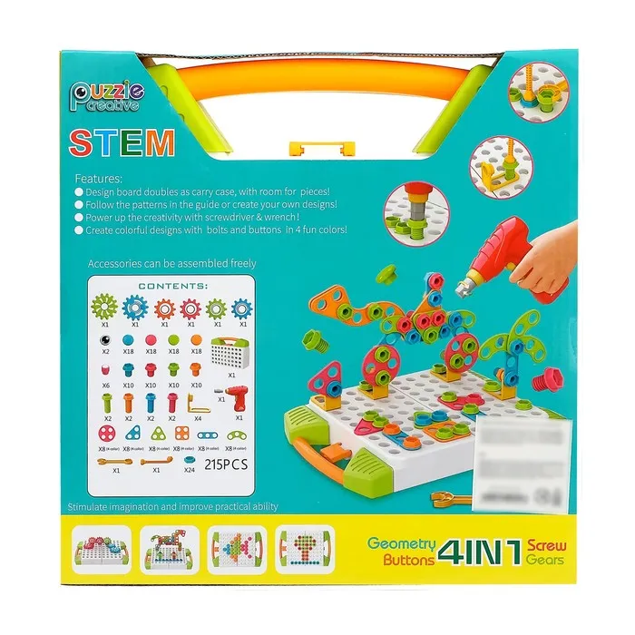 Конструктор винтовая мозайка «Пуговки шестеренки», 4 в 1, с шуруповертом, 215 деталей — Характеристики
